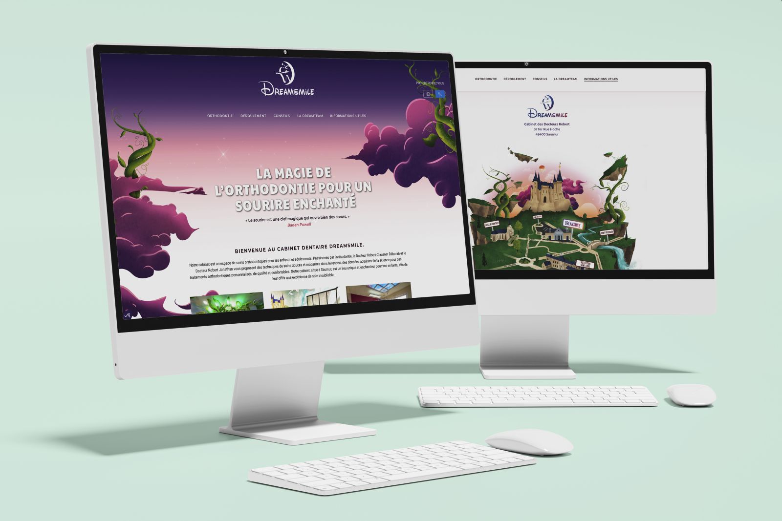 Découvrez Dreamsmile, un espace de soins orthodontiques à Saumur. Une équipe bienveillante pour des traitements d'orthodontie personnalisés et professionnels. L'idée du projet était de mettre en avant la dimension féerique au coeur de la création visuelle. Nous avons réalisé le logo et la charte graphique du cabinet. Nous avons mis nos expertises en commun pour réaliser les photos ainsi que les illustrations pour la réalisation du site internet.